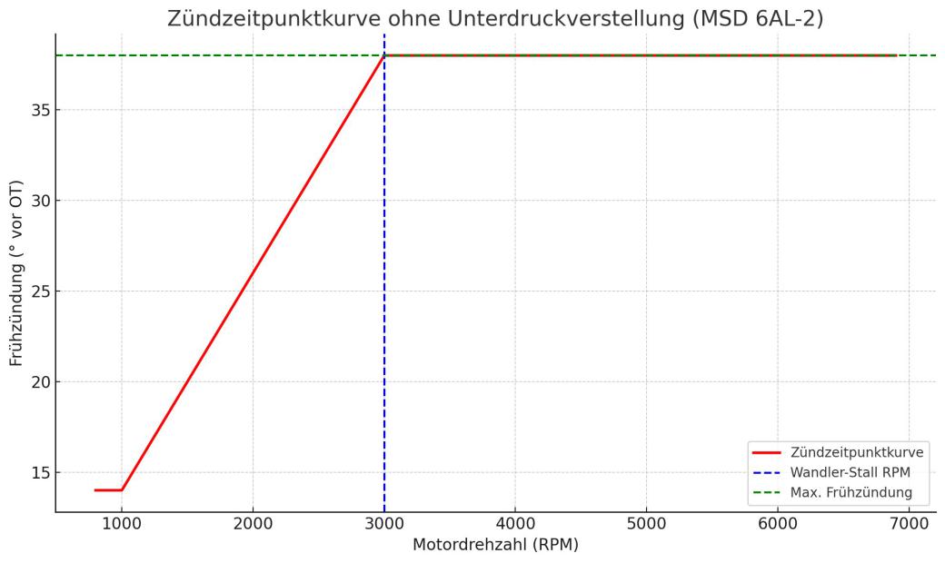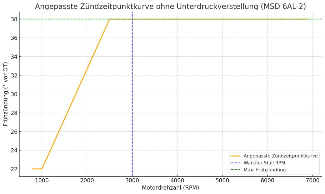 Lineares Hochziehen auf 38° bis 2500 RPM (frühere All-in-Zündung wegen Rennwandler)
