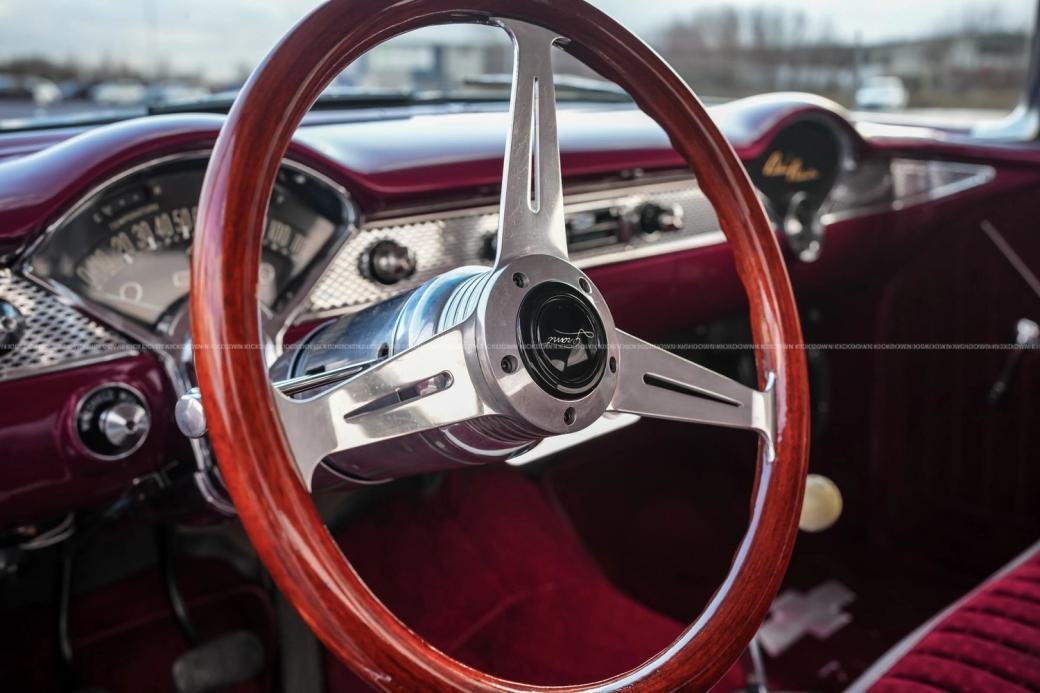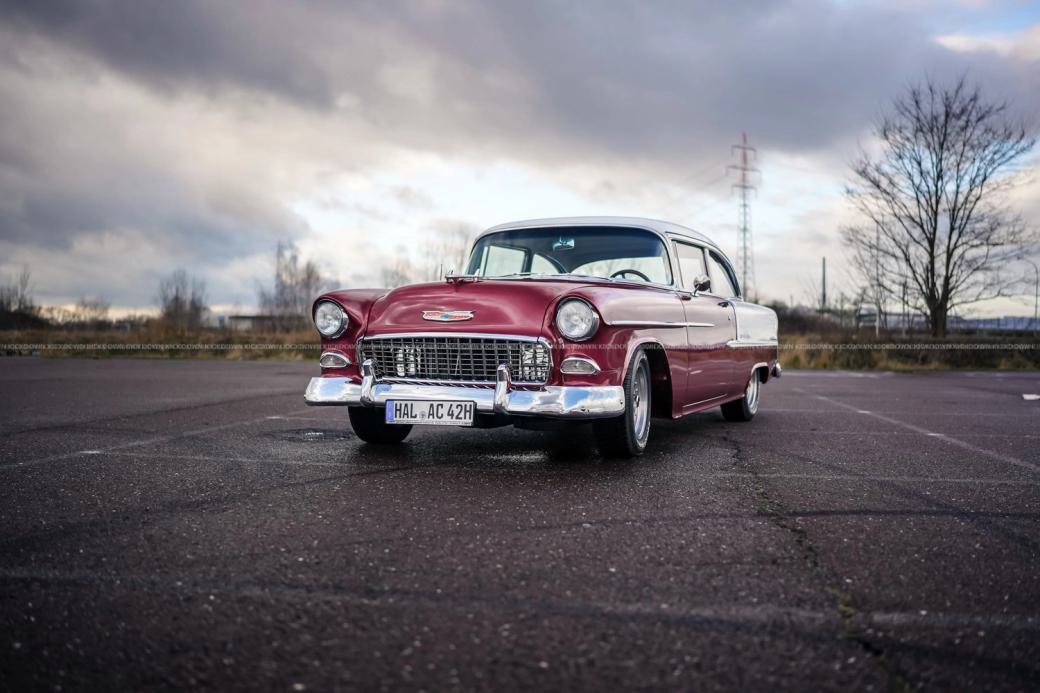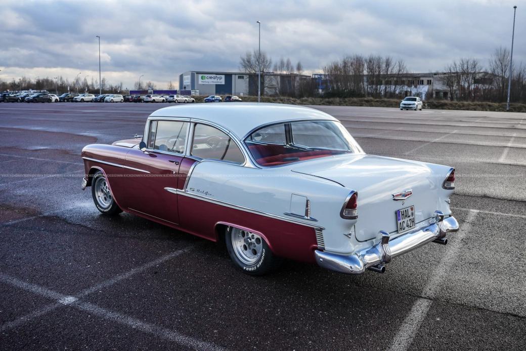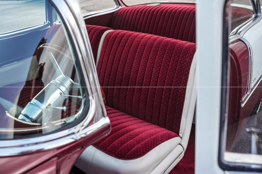 Zum Verkauf steht ein Chevrolet Bel Air 2400C aus dem Jahr 1955 in der Farbkombination Burgunderrot-Weiß und einer Innenausstattung aus rotem Stoff.