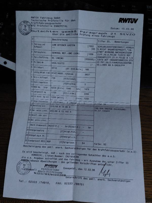 Kopie vom RW TÜV Ennepetal Gutachten §21 eines anderen 59er EL Caminos als Datenblatt.