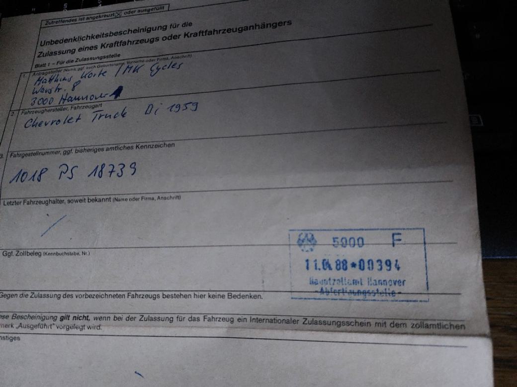 dort steht drauf: Unbedenklichkeitsbescheinigung für die Zulassung eines Kraftfahrzeugs oder Kraftfahrzeuganhängers. Dann steht der damalige Antragssteller drin, der Fahrzeughersteller und eine Fahrgestellnummer.