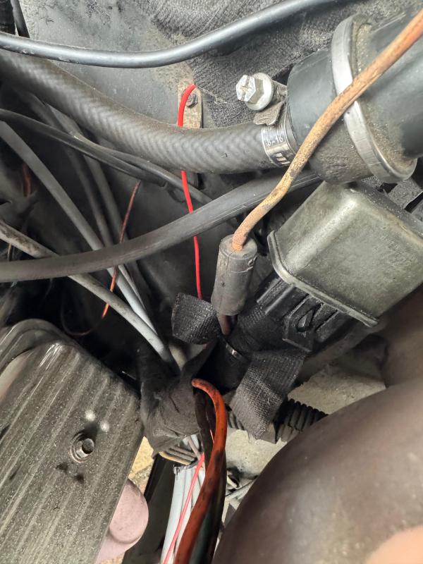 Das schwarze Teil ist eine Sicherung. Das haben alle Fahrzeuge in den 70er Jahren unten am Anlasser gehabt. In den 80ern scheint es wohl nach oben gewandert zu sein. Wahrscheinlich kommt das rote Kabel direkt vom Anlasser. Wenn du keinen Strom mehr hast, ist das Teil die